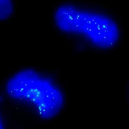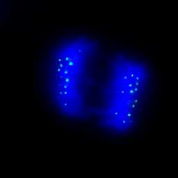 Telophase; the two chromatin shapes become larger as the chromosomes begin to decondensate. |