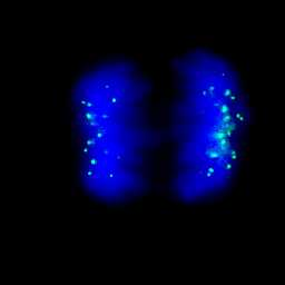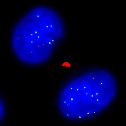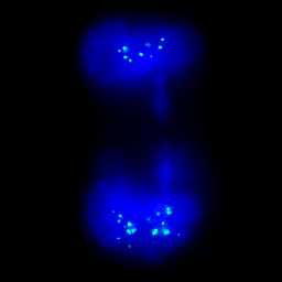 Cytokinesis; chromosomes are decondensed; chromosomal passenger proteins (red, Aurora B kinase) concentrate on the midbody between the two newly formed nuclei. |