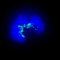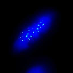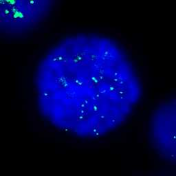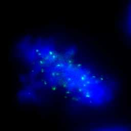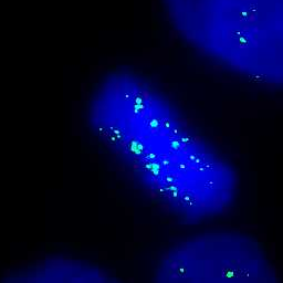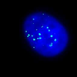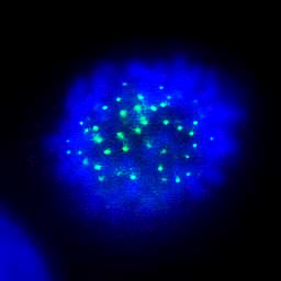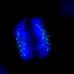 They represent fixed HeLa cells whose DNA has been stained with Hoechst; the cells express a GFP-CENP-A fusion protein, which localizes to the centromeres (giving the green dots staining).